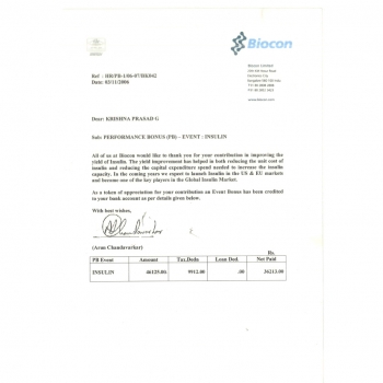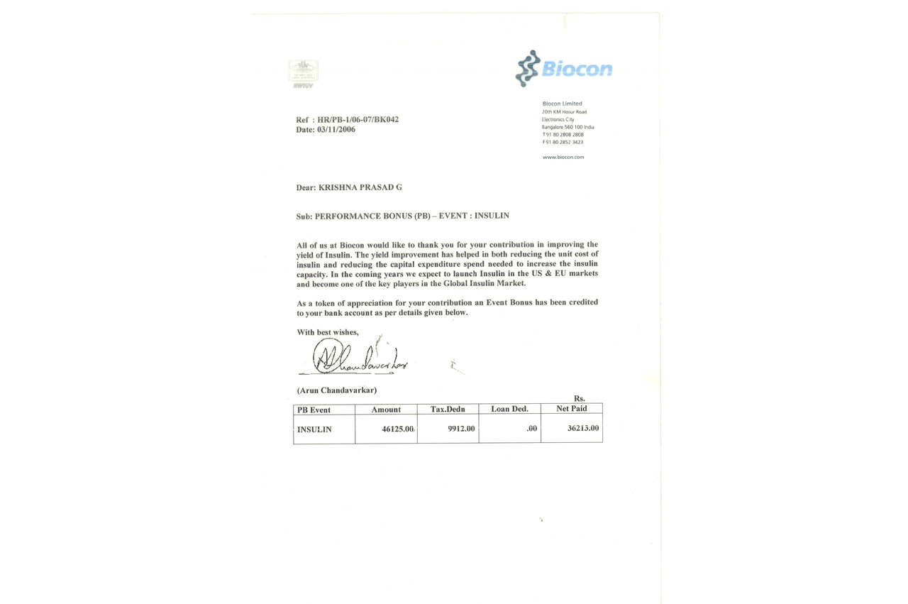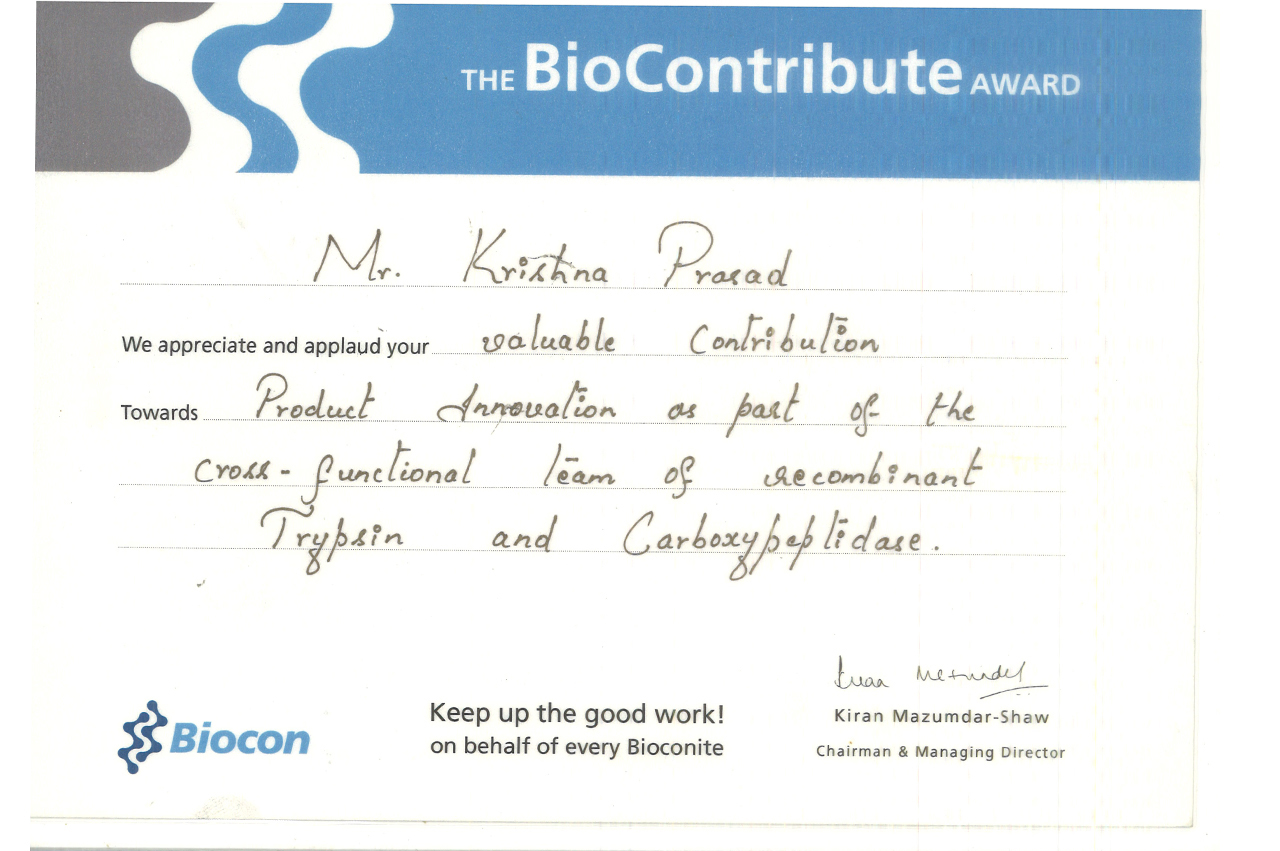 • Start performer for 3 years in Biocon for outstanding contribution.