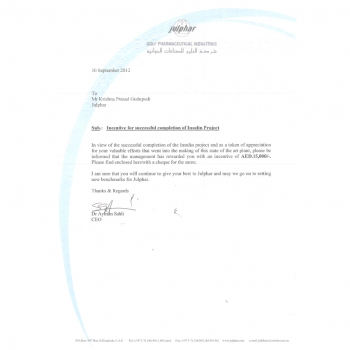 • Received special Bonus for exceptional performance including Bonus for the previous year at the time of exit in Julphar.
