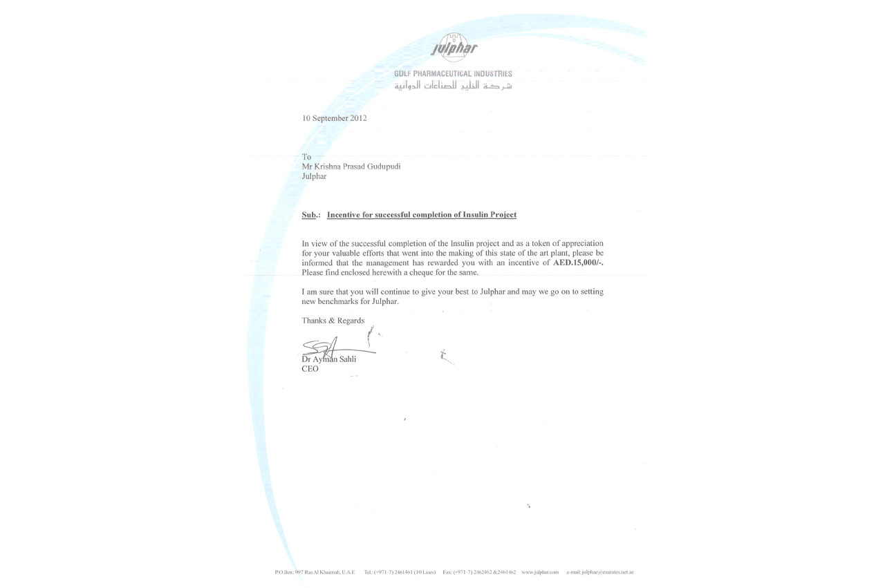 • Special award for successful completion of insulin project by CEO in Julphar-UAE