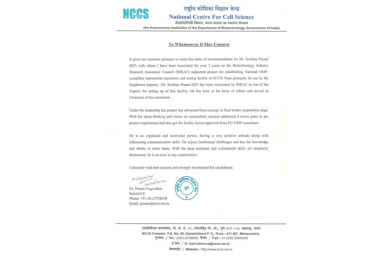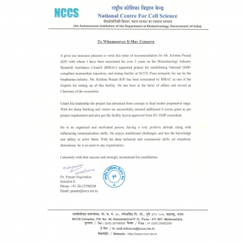 • Served as Chairman of committee in NCCS-Pune for “Establishment of GMP-Compliant National Repository for banking safe deposit of characterized Cells for use in Biopharma”. Currently driving the establishment of this facility.